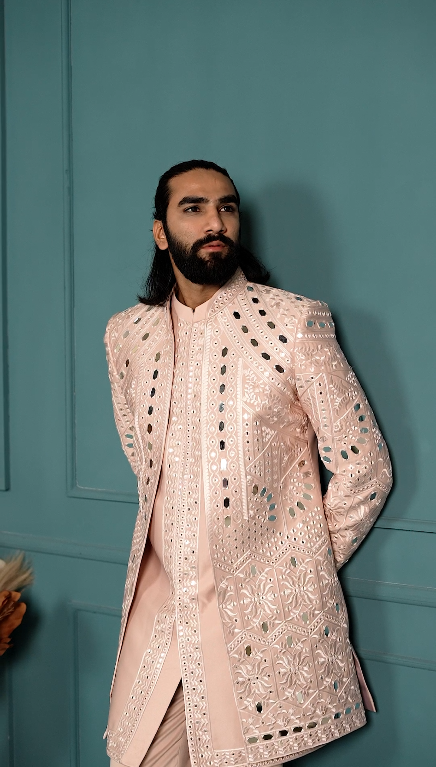 Step into timeless elegance with our Peach Mirror 3-Piece Indo Western Set, a perfect fusion of tradition and contemporary style.